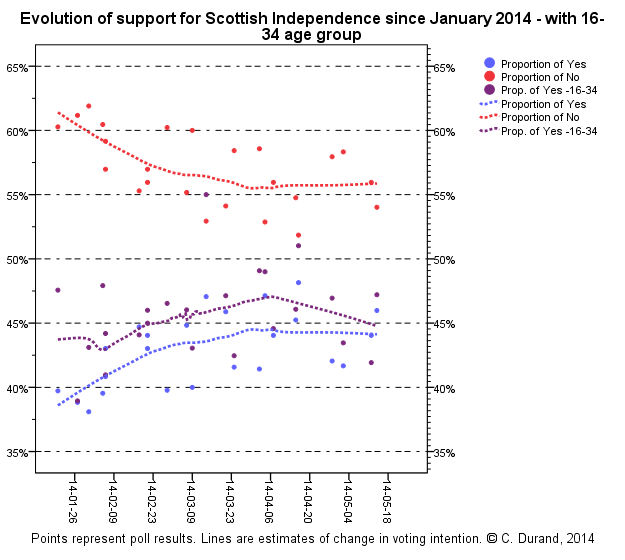 The following graph shows support for independence from January 2014 to the most recent polls among the whole population and among the 16 to 34 years old (purple line ). I computed a weighted average of the results by age group (age group by sex for Panelbase) presented by the different firms in order to arrive at a combined 16-34 age group*.